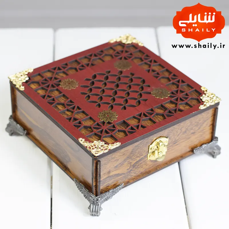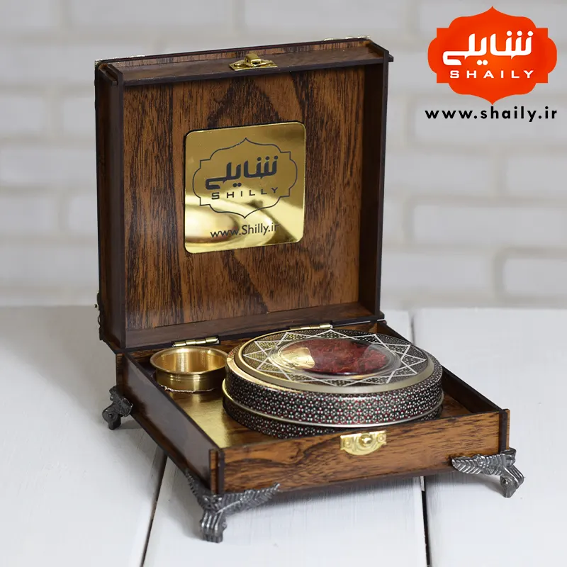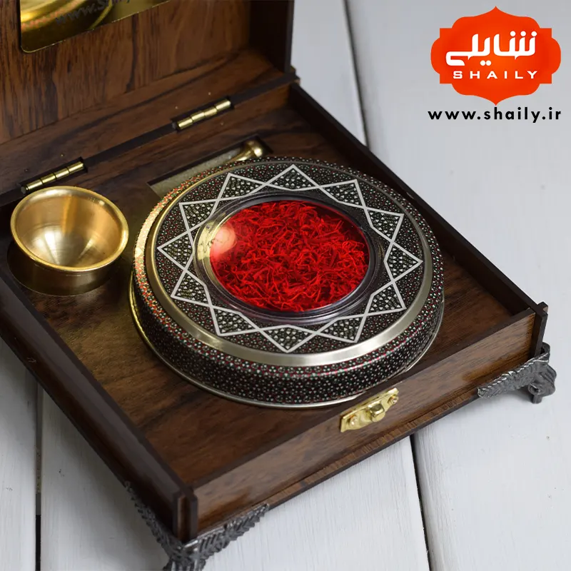 پک کادویی چوبی پایه دار حاوی نیم مثقال زعفران ارگانیک قائنات